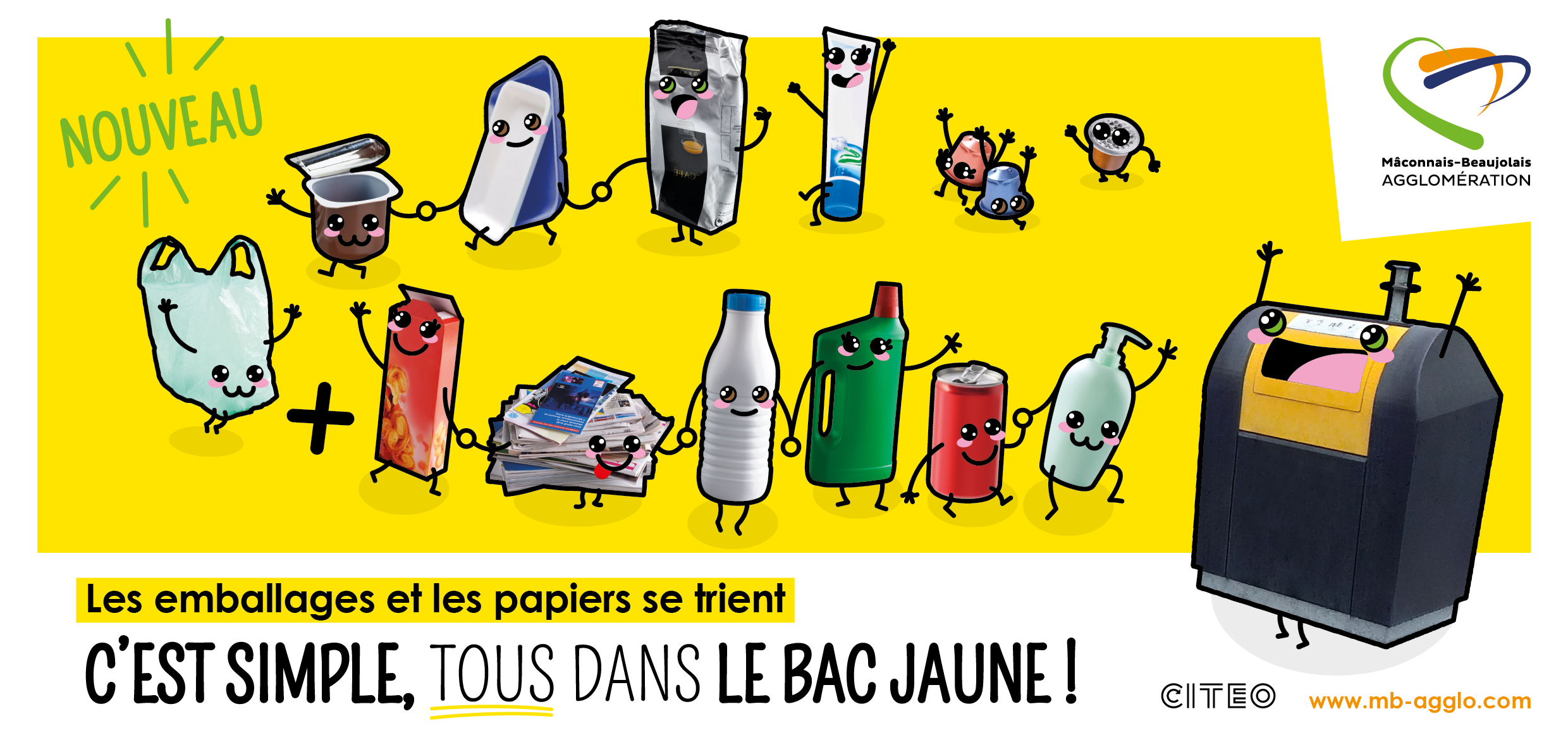 Tous les emballages plastiques et métalliques, les cartonnettes et les papiers se trient ensemble dans les colonnes et les bacs jaunes. Les emballages en verre se déposent toujours dans les colonnes vertes. Le plastron bleu a fait place au jaune.